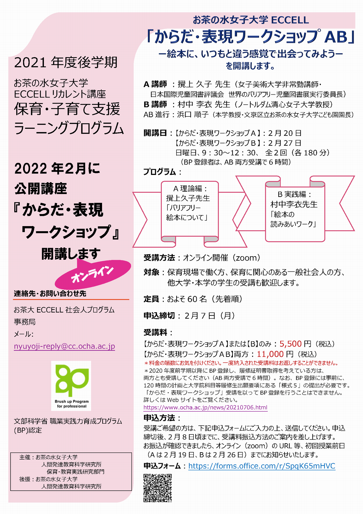 「からだ・表現ワークショップA」または「からだ・表現ワークショップB」各5,500円(税込) 「からだ・表現ワークショップA」および「からだ・表現ワークショップB」11,000円(税込) *お振込み方法については、お申込み後にご案内します。 *料金の端数にお気を付けください。一度納入された受講料はお返しすることができません。 *2020年度前学期以降にBP登録し、履修証明書取得を考えている方は、両方とも受講してください(AB両方受講で12時間)。なお、BP登録には事前に、120時間の計画と大学院科目等履修生出願要項にある「様式5」の提出が必要です。「からだ・表現ワークショップ」受講を以ってBP登録を行うことはできません。詳しくはWebサイトをご覧ください。https://www.ocha.ac.jp/news/20210706.html |