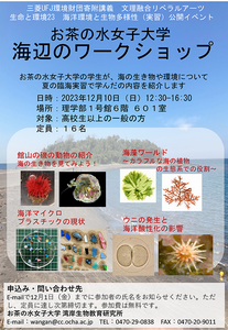 夏の臨海実習で、海の生き物や海洋環境について学んだ成果を学生が発表します。生きた海の動物などの実物を使って行うワークショップです。さまざまな海の生き物の多様性や、海洋環境の中での役割、海洋酸性化やマイクロプラスチックの問題など、海の生物と環境に興味のある方、どうぞ奮ってご応募ください。