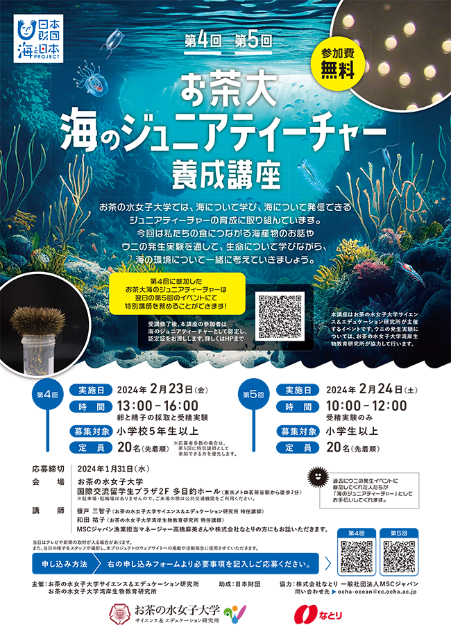 「サイエンス&エデュケーション研究所主催 第4回、第5回 お茶大 海のジュニアティーチャー養成講座」では参加者を募集しています。