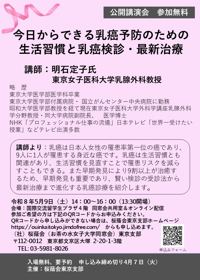 このたび、桜蔭会東京支部にて公開講演会を開催いたします。 皆様のご参加をお待ちいたしております。