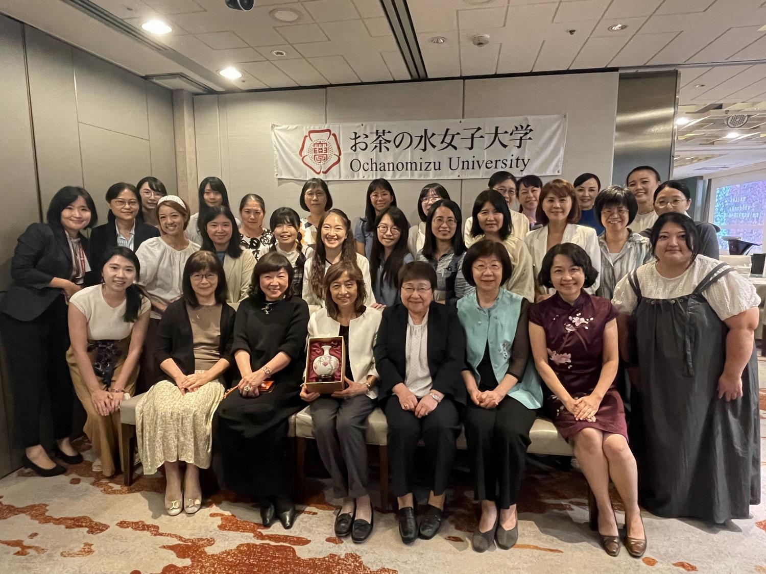 2025年12月20日(土)、台湾では7年ぶりとなる海外同窓生懇談会を台北にて開催し、各地より元留学生27名が参加しました。学長挨拶の後、歓談を交えながら、チーム対抗のお茶大ミニクイズ、本学及び同窓生の近況報告を行いました。同窓生は、留学当時の写真を持ち寄り、教員や仲間との思い出を辿りながら、笑顔で旧交を温めていました。また、本学が以前開催した恩田員海外同窓生懇談会での出会いをきっかけに、他国の同窓生同士が国を越えてオンライン授業を実現したとの報告もありました。閉会後も写真を撮影し合うなど、会場は和やかな雰囲気に包まれました。
