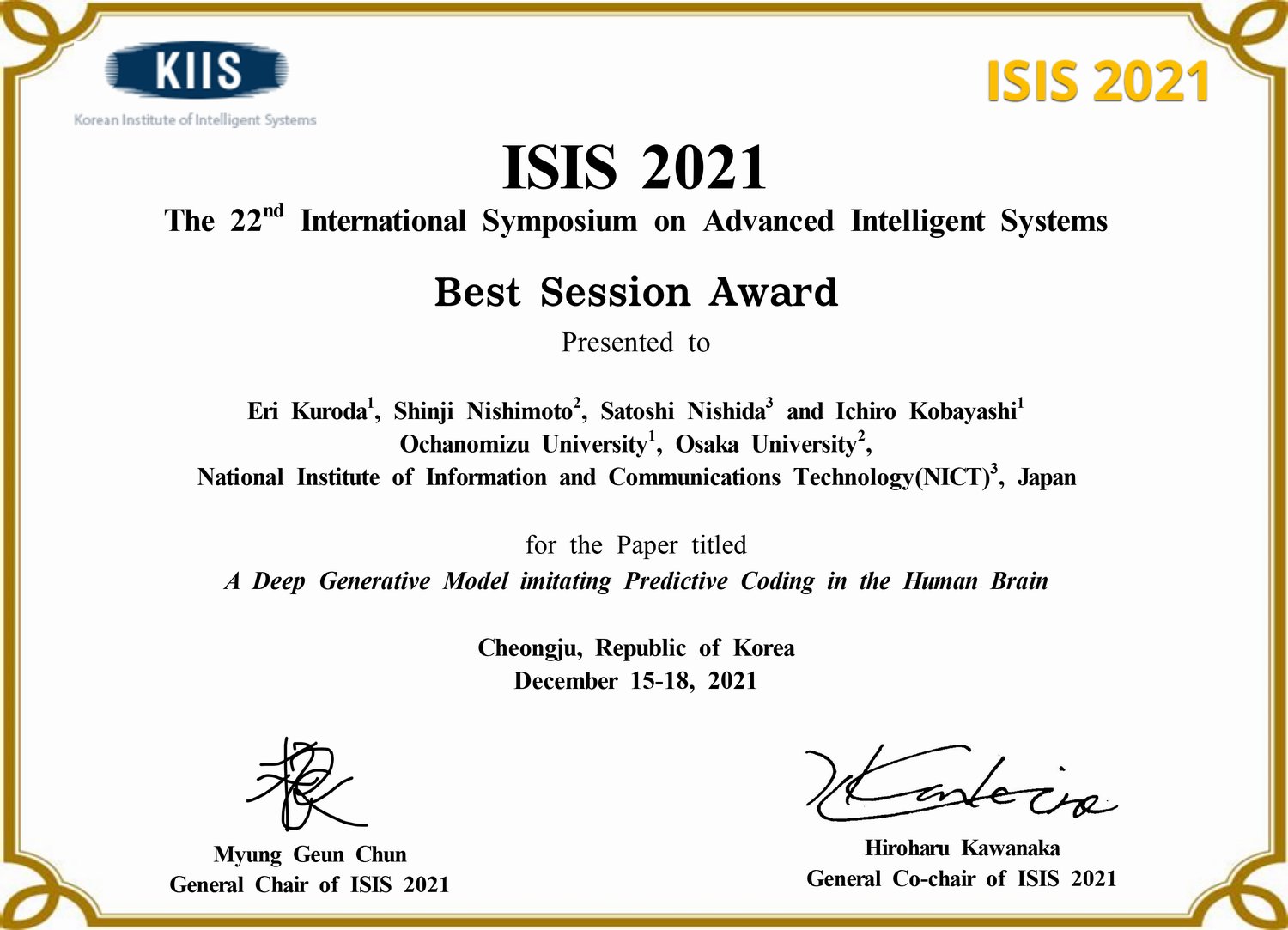 大学院理学専攻情報科学コース博士前期課程2年生の折口希実さん、黒田彗莉さんが、2021年12月15日(水)~18日(土)にオンラインで開催されたThe 22nd International Symposium on Advanced Intelligent Systems(ISIS2021)にてBest Session Awardを受賞しました。