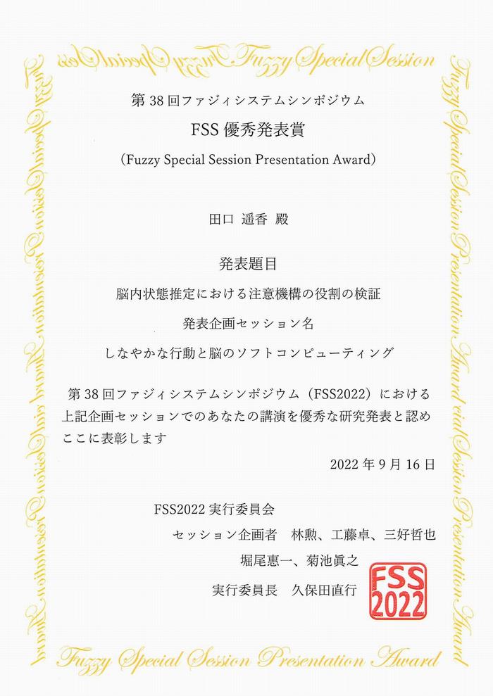 大学院理学専攻情報科学コース博士前期課程2年の田口遥香さんが第38回ファジィシステムシンポジウム/FSS2022にてFSS優秀発表賞を受賞しました。