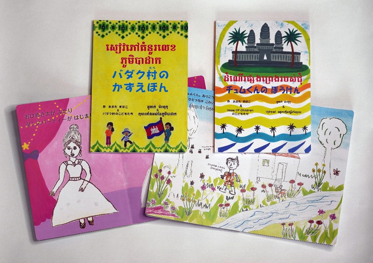 2020年にはバダク村の子どもたちが描いた絵にカンボジア語のストーリーをつけたオリジナル絵本『バダク村のかずえほん』を制作。今回の絵本『チュムくんのぼうけん』はこれに続く2冊目です。首都プノンペンをはじめ7州の小学校に配布されることになりました。カンボジアではカンボジア語の本が少なく、多くは英語の本で、特にカンボジア語の絵本はとても貴重だそうです。カンボジアの子どもたちが描いた絵を用いるという、一方的な援助ではない協働の姿勢が、教育省からも称賛されました。太田さんの2冊の絵本は、グローバル文化学環とグローバル協力センターの図書室に置かれています。