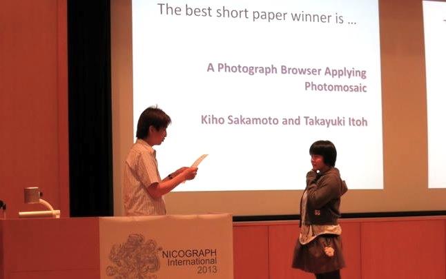 大学院人間文化創成科学研究科理学専攻情報科学コース博士前期課程1年の坂本季穂さんが、2013年6月2, 3日に九州大学西新プラザで開催された NICOGRAPH International 2013 においてベストショートペーパー賞を受賞しました。
