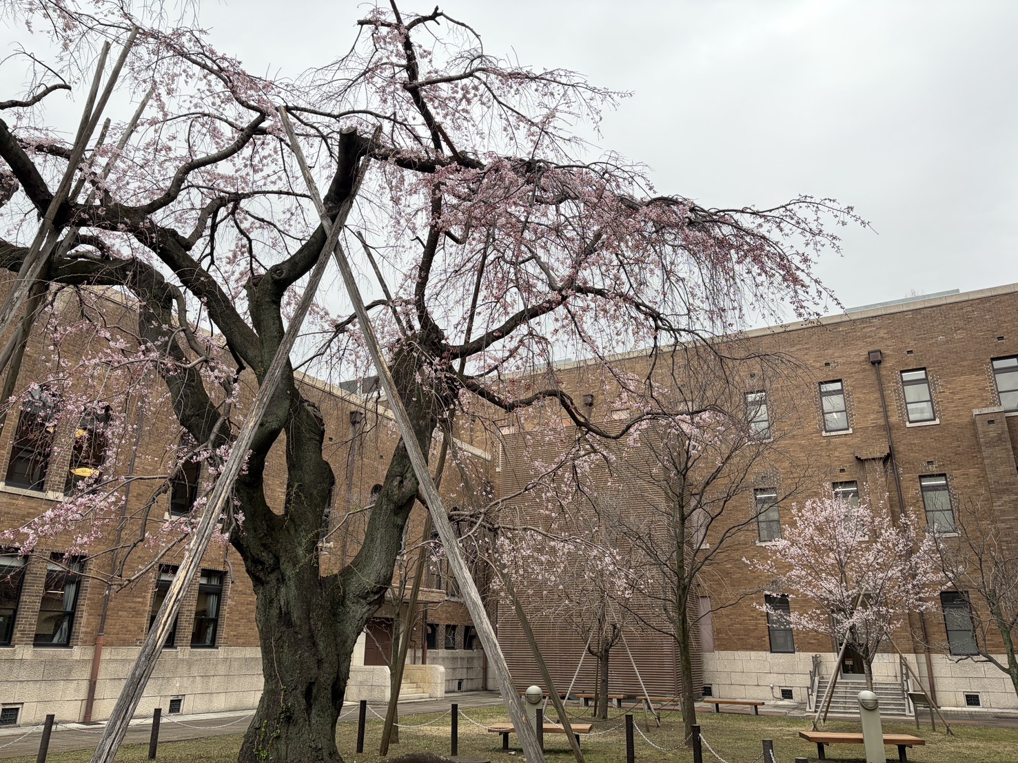 大学本館の中庭では、3本の桜が寄り添うように立っています。
